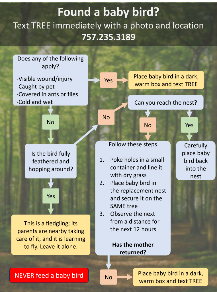 Every bird species has its own unique way of graduating from hatchling, to nestling, to fledgling and beyond. If you find a baby bird on the ground, simple steps like the ones below can help you decide if you should help. However, because there are so many factors and time can be critical in some species, the first step you should take is to reach out to TREE.